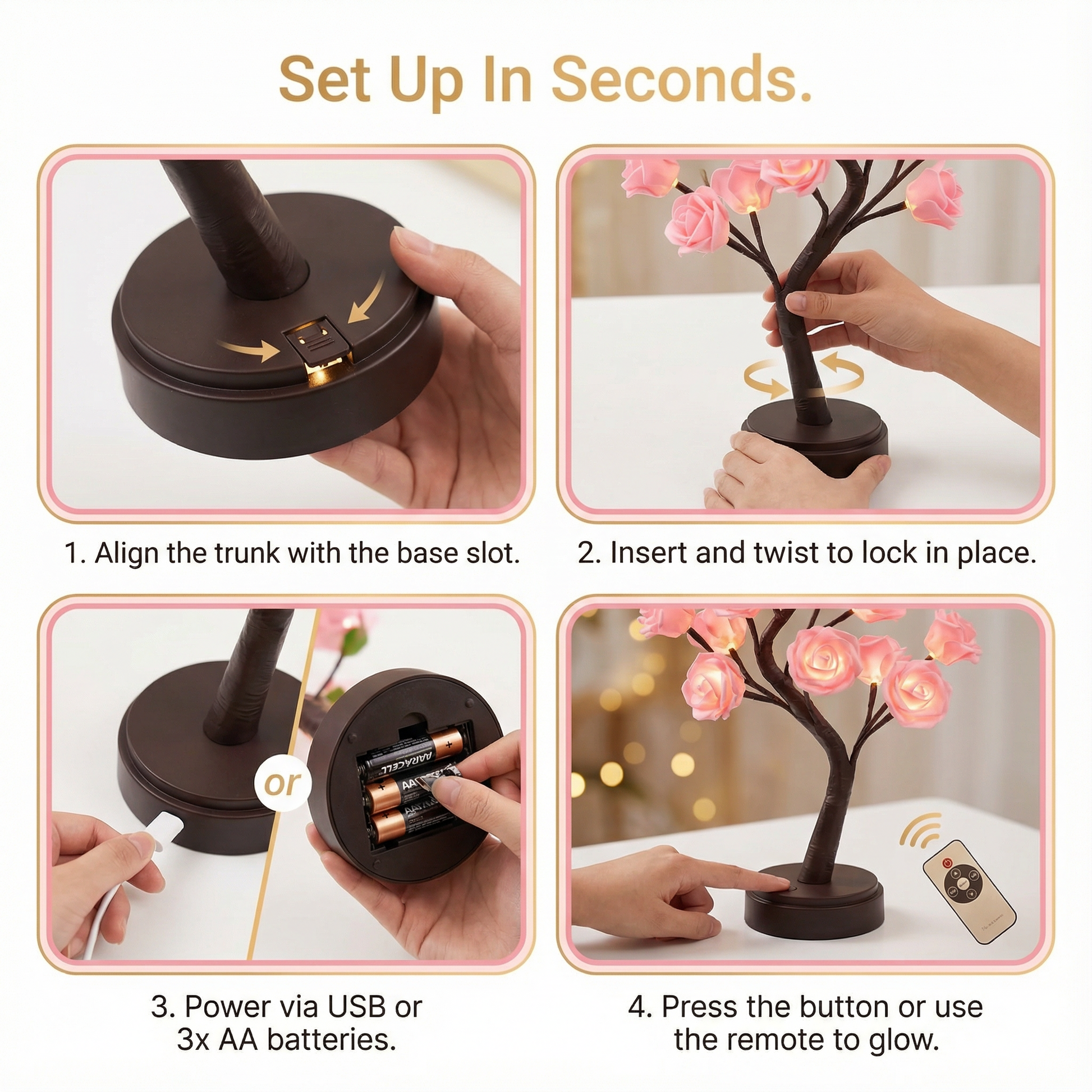 Plug in via USB or add 3 AA batteries. Press the button or use the remote to make it glow.
