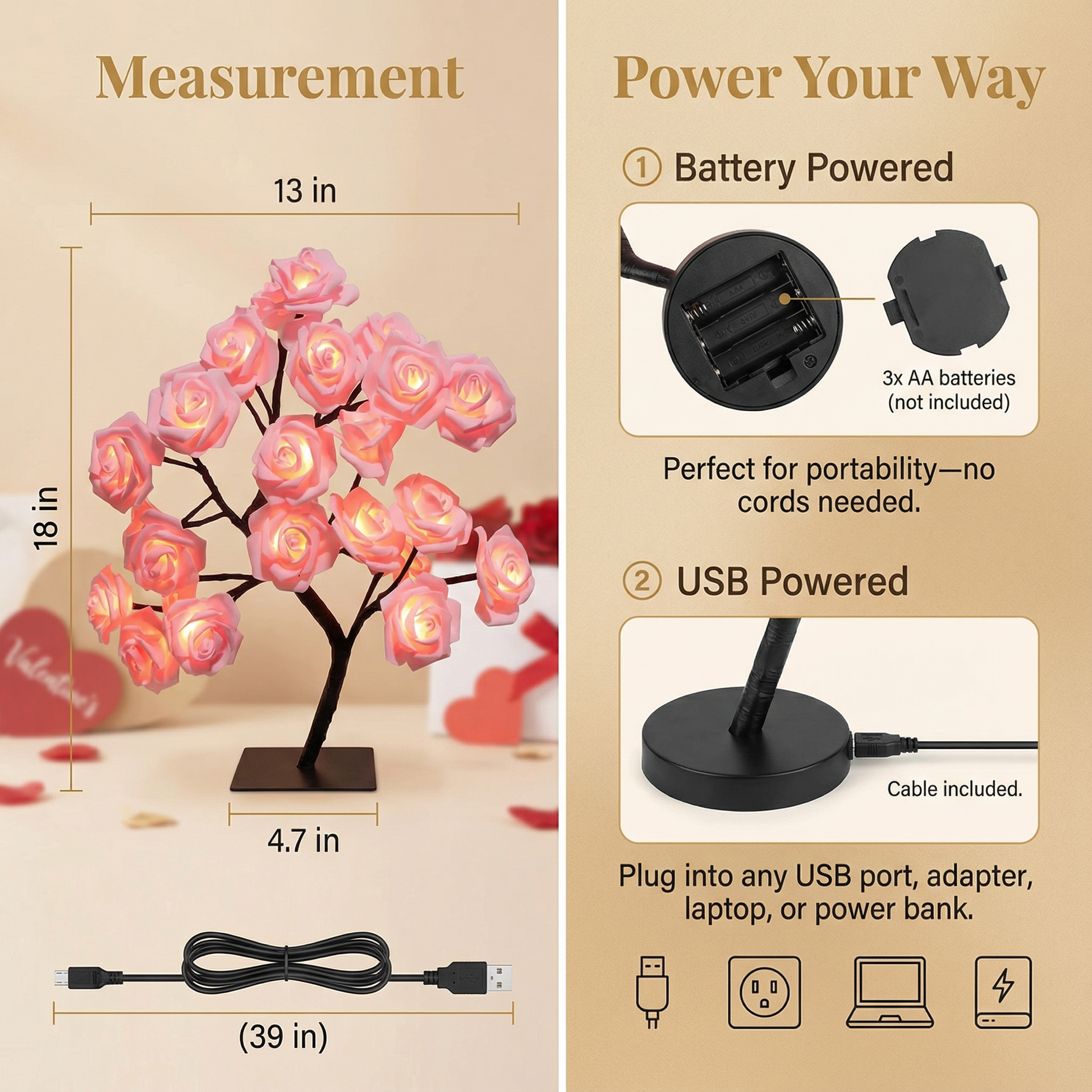 Two options: USB cable (included) or 3x AA batteries (not included). Plug into any USB port, wall adapter, laptop, or power bank—or go wireless with batteries for easy placement anywhere.